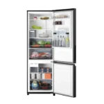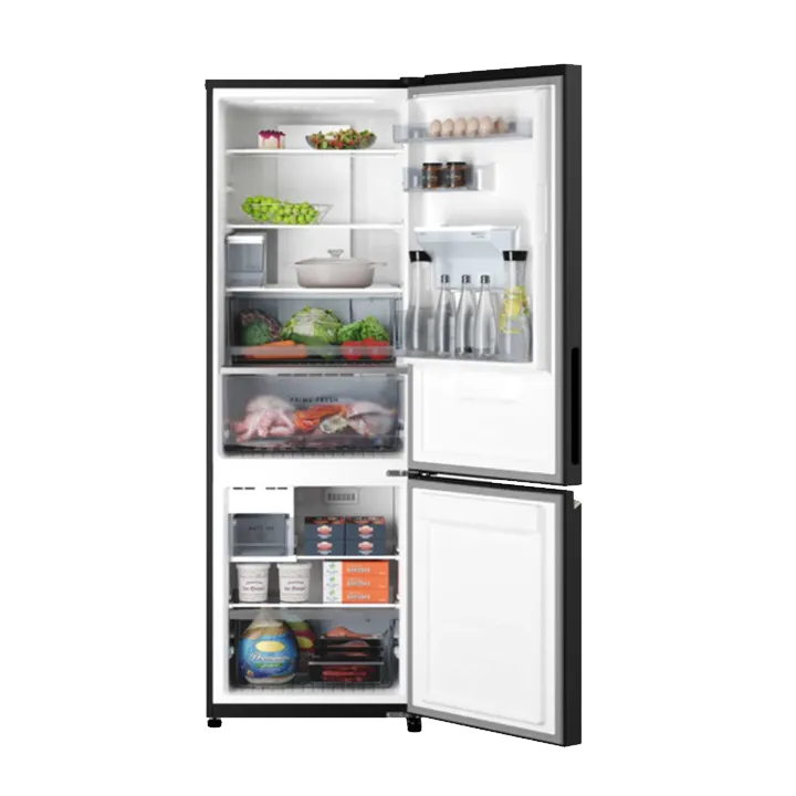 Tủ lạnh nổi bật với thiết kế phẳng tinh tế, cửa tủ kim loại đen sang trọng phù hợp với không gian nội thất hiện đại. Tủ lạnh 2 cửa này có thiết kế ngăn đá phía dưới thay vì ngăn đá trên như các dòng sản phẩm phổ thông cũ. Cách bố trí ngăn mát ở trên sẽ vô cùng tiện lợi bởi ngăn mát là nơi được dùng thường xuyên hơn, người dùng sẽ không cần cúi người khi lấy thực phẩm. Dung tích sử dụng 325 lít, trong đó, ngăn lạnh dung tích 228 lít, ngăn đá 97 lít phù hợp với nhu cầu sử dụng của gia đình 3 – 4 người. Bạn sẽ thoải mái dự trữ thực phẩm cho gia đình trong nhiều ngày mà vẫn đảm bảo độ tươi ngon, an toàn cho sức khỏe.